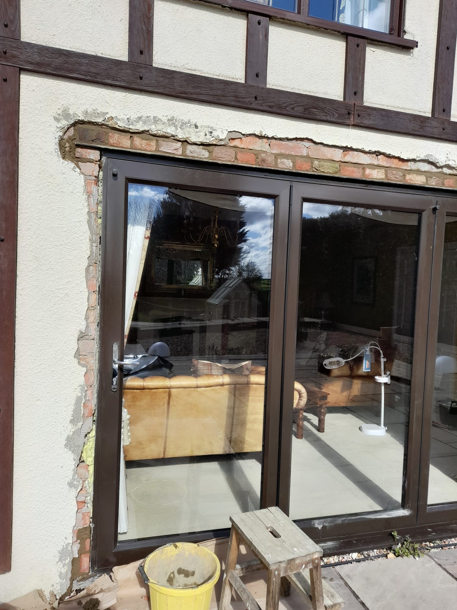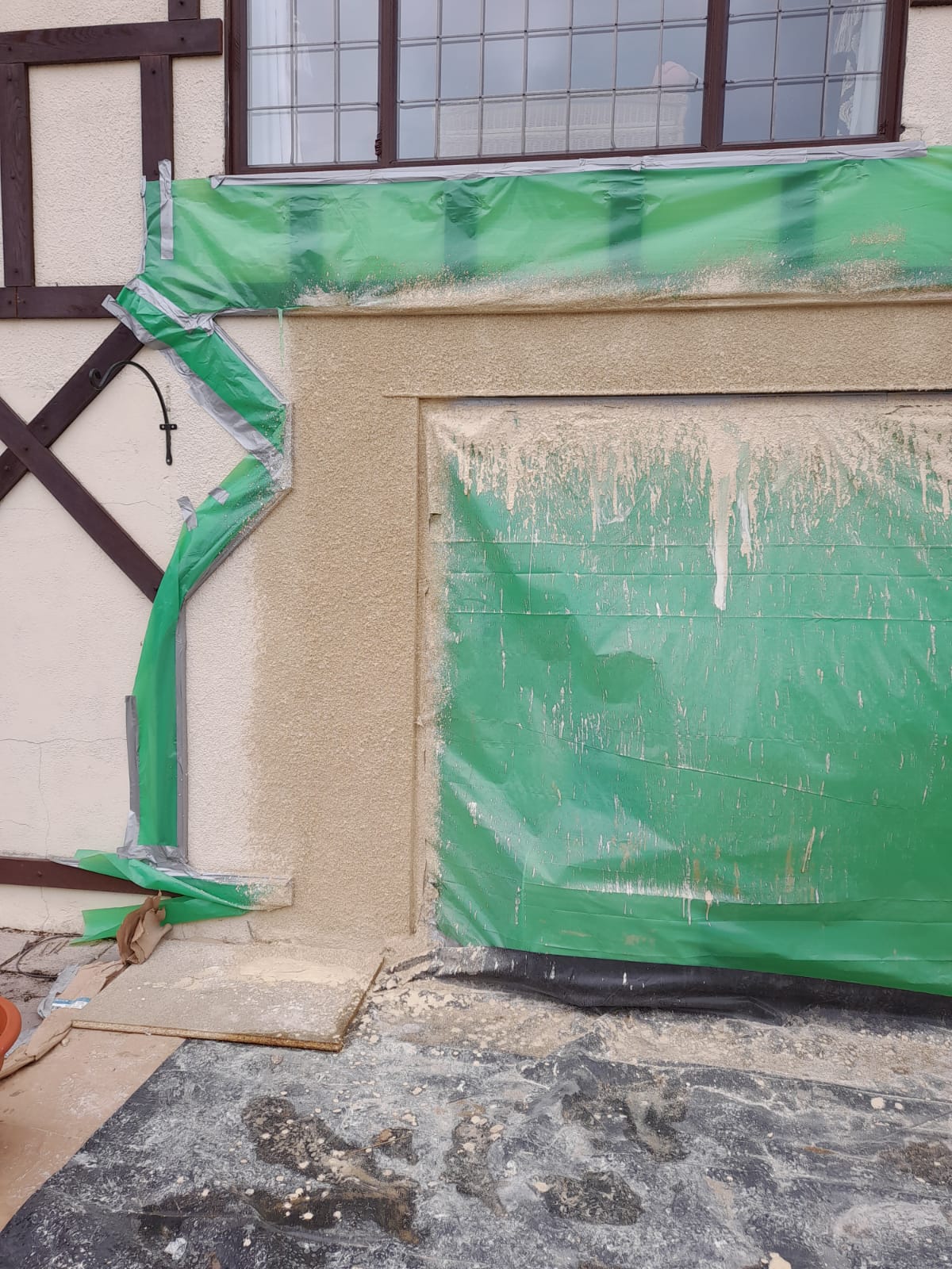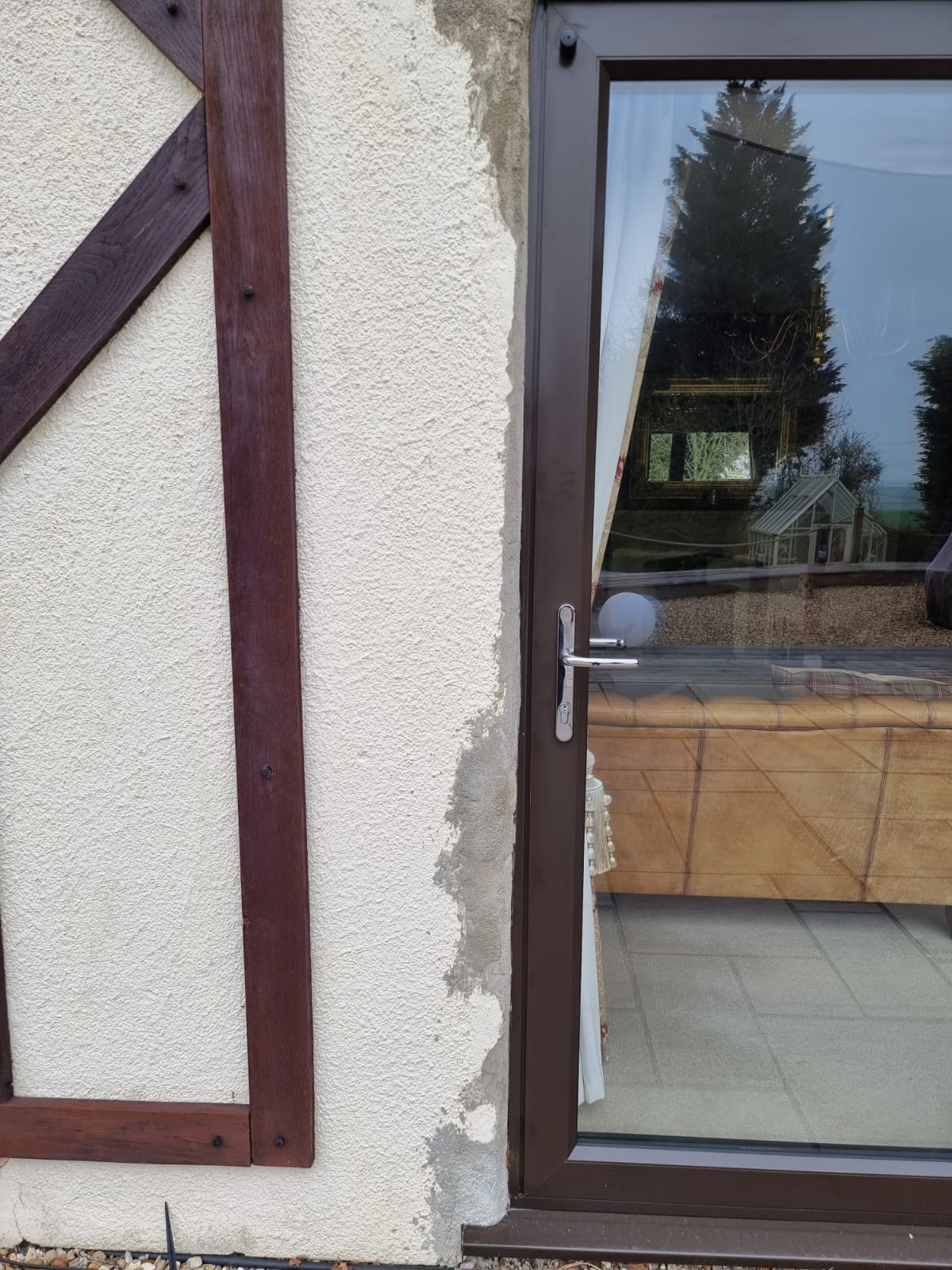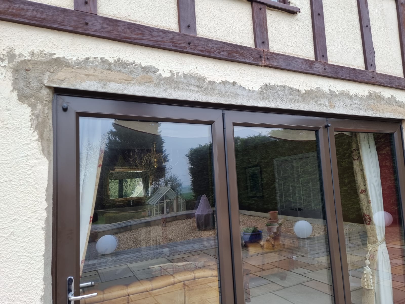 Original window fitters did not render the wall well, we took the old render off and got to a place where we could then improve and refill to match the surrounding render. We have planned to cover the seam with another bit of wood cladding. The customer was very happy with the results.